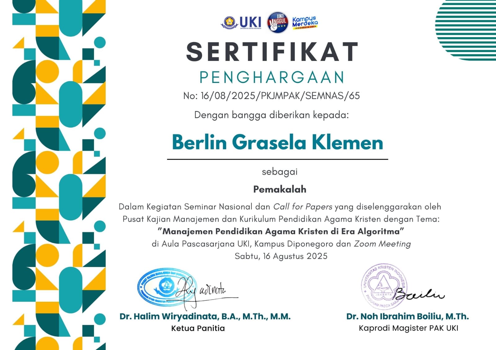 Sertifikat Mahasiswa sebagai Pemakalah di Seminar Nasional